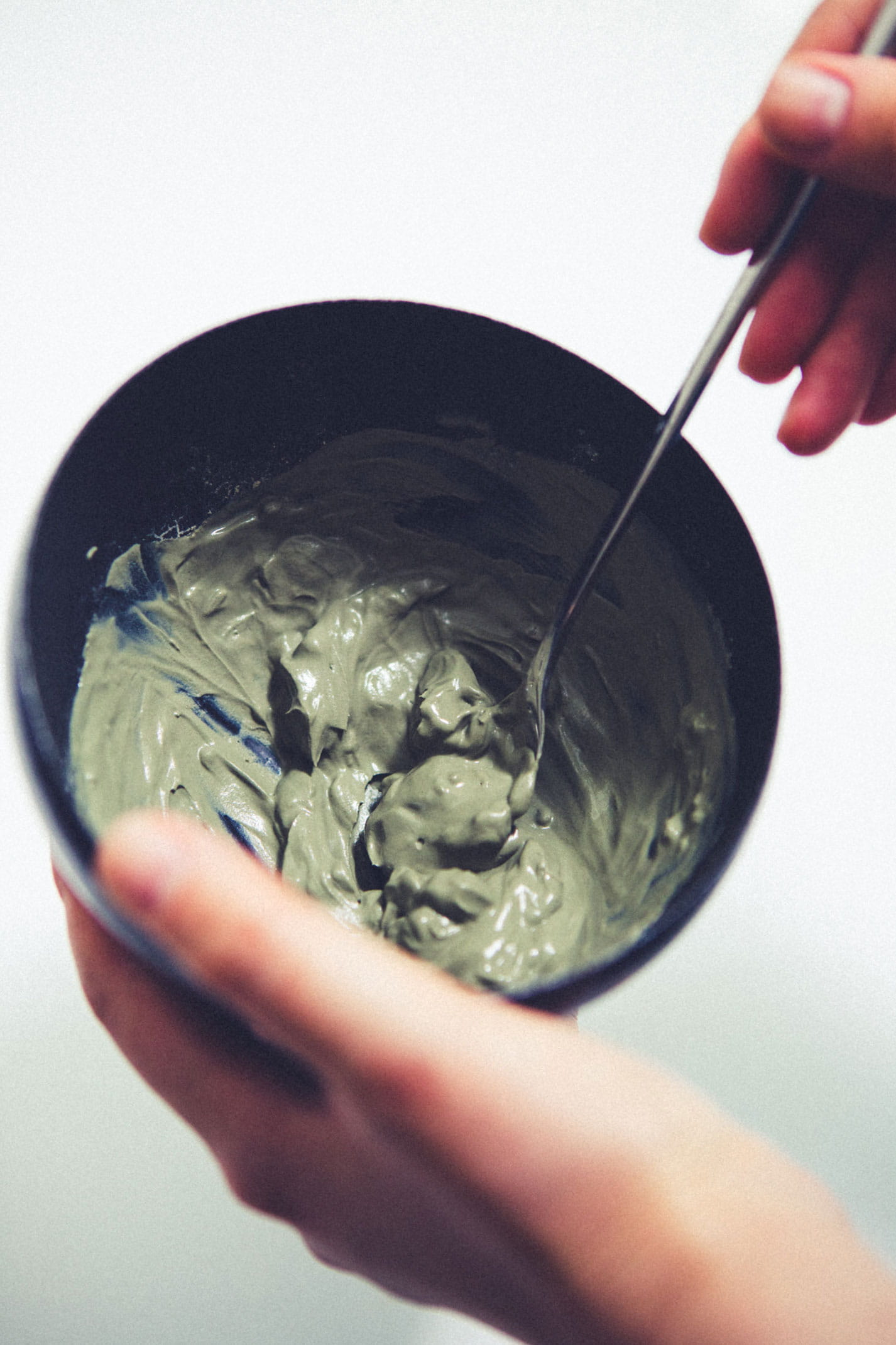 クレイ1回分(大さじ1杯程度)を器に出し、お水やハーブウォーター(小さじ2杯程度)を回し入れます。